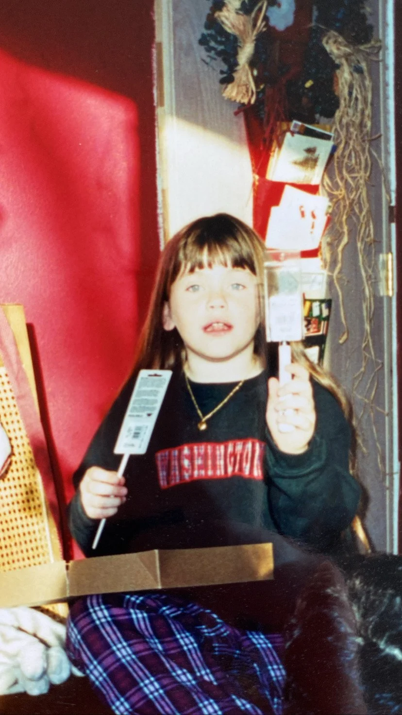 9 year old Becca shows off her new Bob Ross paint knife and brush set. Pay attention, and you’ll probably spot 33 year old Becca using these same tools today.